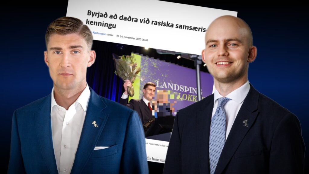 Kristófer Máni Sigursveinsson, 2. varaþingmaður Miðflokksins í Suðurkjördæmi, er óánægður með frétt sem Vísir birti í morgun. Þar er varaformaður flokksins, Snorri Másson, sakaður um að dreifa rasískri samsæriskenningu. Með fréttinni birti Vísir mynd frá landsþingi Miðflokksins þar sem Snorri var kjörinn varaformaður. Á myndinni er Snorri að fagna sigri og heldur á tveggja ára gömlum syni sínum.