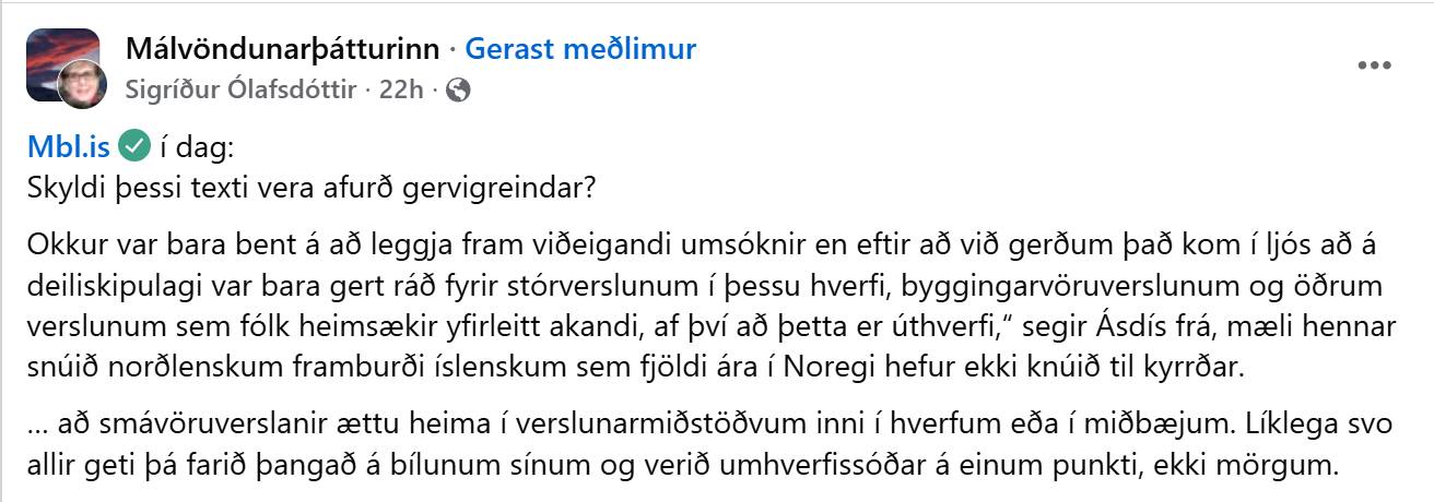 „Og áfram heldur það, Sigríður Ólafsdóttir opinberar textafræðilegan vísdóm sinn með vísun í helgarviðtal mitt um íslensk hjón í Fredrikstad með sömu gömlu tuggunni og gengur í flestum haturshópum málfarspostulanna á Facebook sem aldrei hafa flett öðrum bókum en tékkhefti. Kostulegt er að fylgjast með þessari nýju möntru fólks sem skilur ekki íslenskt mál, þá er bara hrópað „gervigreind, gervigreind!“ svo minnir á kaldastríðsótta sjöunda og áttunda áratugar síðustu aldar þegar „Rússarnir eru að koma!“ var viðkvæðið um erlendar ógnir, óháð því hvaðan þær komu. Broslegt að sjá fólk ítrekað verða sér til skammar í botnlausri fáfræði, skilningsleysi og vanþekkingu á eigin tungu. Mættuð þó gjarnan hætta að beina máttlausu hatri ykkar og nötrandi heift að mér þegar dagleg þörfin til að drulla yfir aðra sækir að ykkur eins og sykurfíkn að barni.“