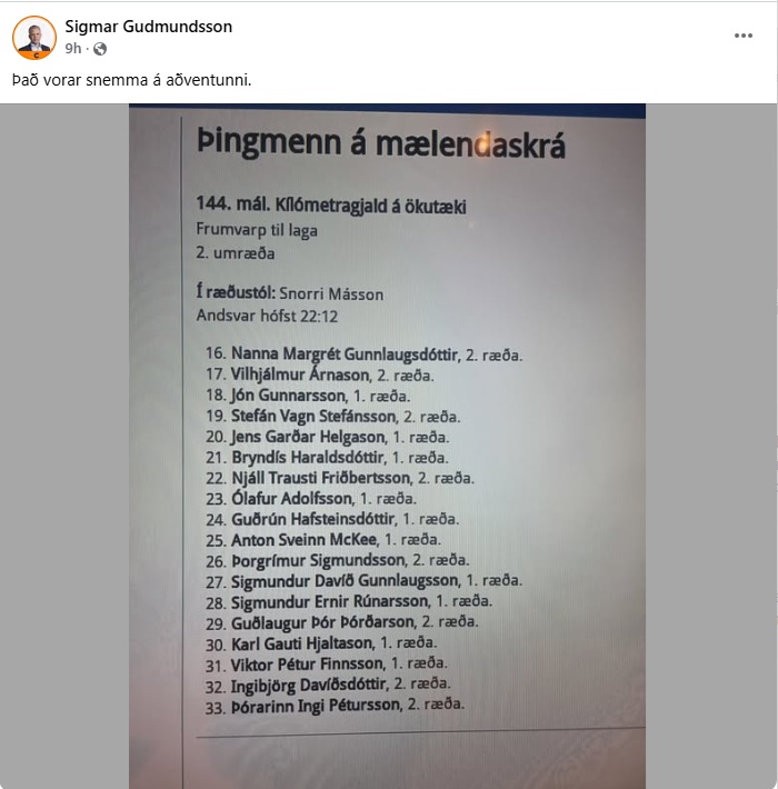 Því svaraði Sigmar svona: „Hárrétt. Það var vitað. Þetta er bara svo falleg og vel mönnuð mælendaskrá að mér fannst rétt að deila henni með vinum mínum á FB. Það má jafnvel kalla þetta jólaglaðning.“ Hann bætti svo við: „Ingibjörg Isaksen. Það er rými fyrir fleiri á mælendaskrá. Fjarvera þín öskrar á mig.“