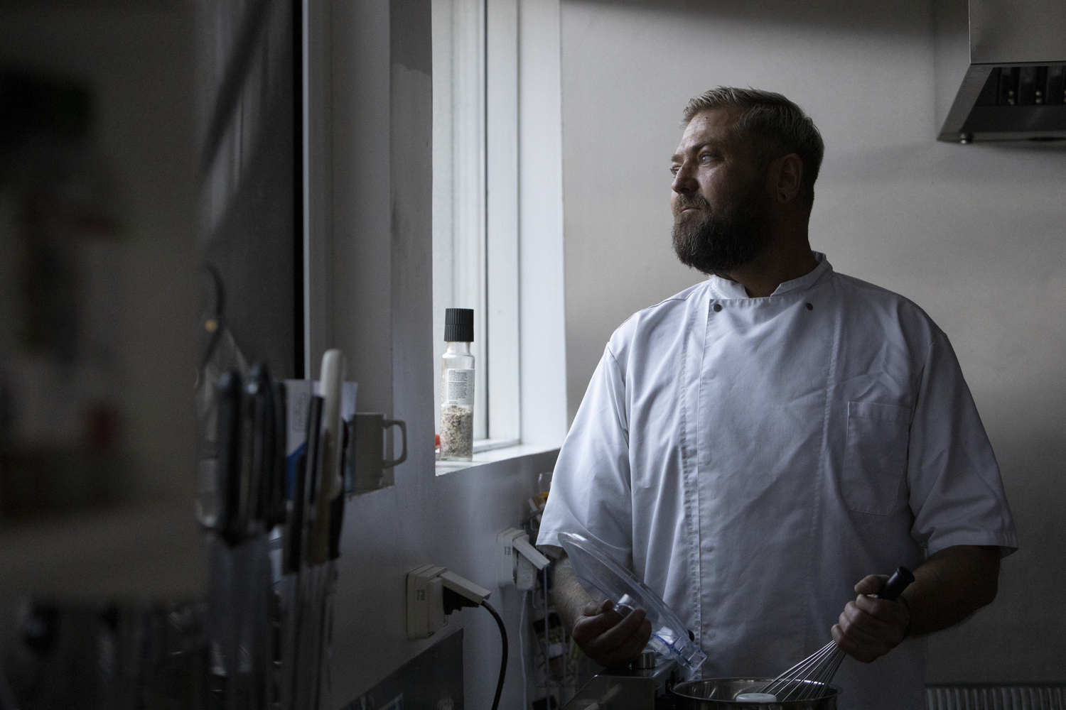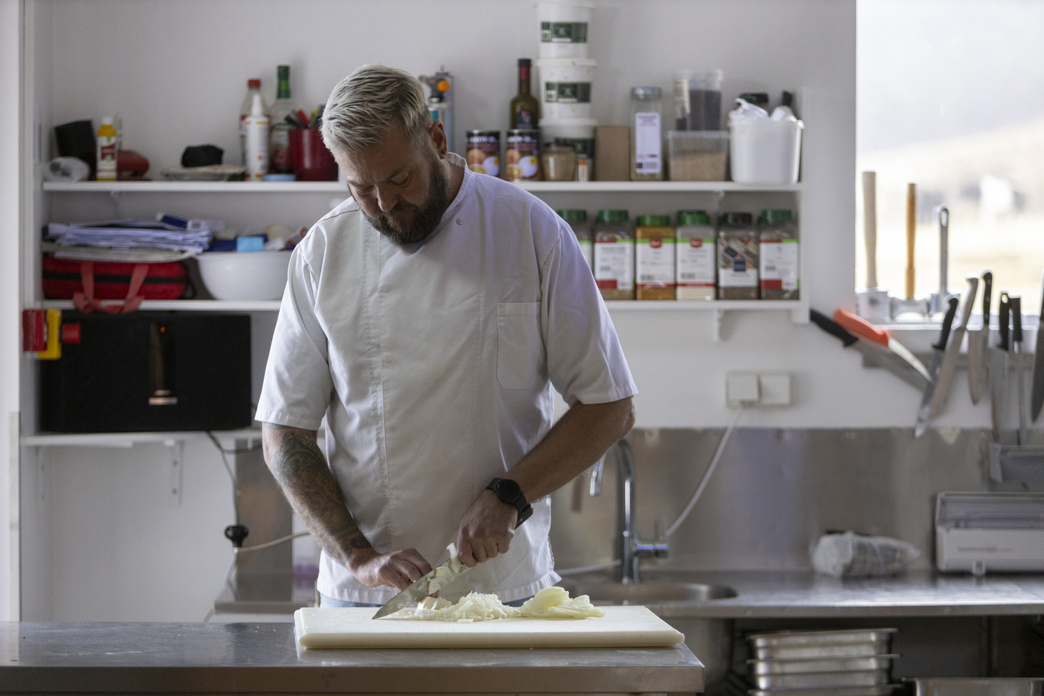 „Ég hef verið öryrki frá árinu 2018 vegna ýmissa líkamlegra kvilla,“ segir hann. „Ég byrjaði hér í maí og er að vinna í fyrsta skipti frá árinu 2018. Þetta er 75% vinna og hentar mér mjög vel. Hér er hægt tempó og ég kem úr umhverfi þar sem er rosalega mikið álag, að kokka á sjó og í stóru atvinnueldhúsi. Hér líður mér hins vegar ekki eins og ég sé í vinnu. Mér finnst æðislegt að vera hérna og elska.“