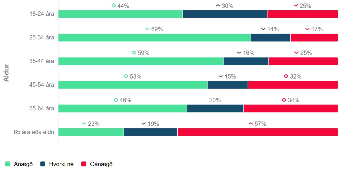Þau sem eru 25-34 ára eru marktækt ánægðari með breytinguna en aðrir aldurshópar. Þau sem eru 65 ára eða eldri eru marktækt óánægðari með breytinguna en þau sem yngri eru.