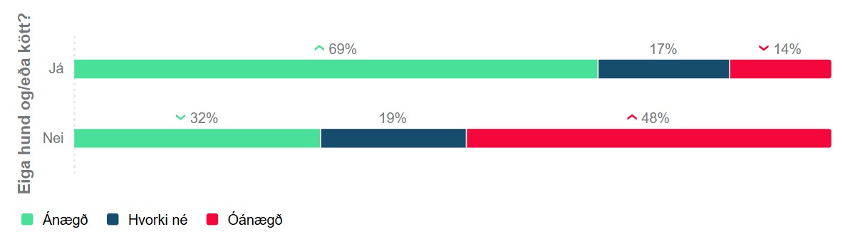 Þau sem eiga hund og/eða kött eru marktækt ánægðari með breytinguna en þau sem eiga ekki hund og/eða kött. 69% þeirra sem eiga hund og/eða kött eru ánægð með breytinguna og 14% óánægð. 32% sem eiga ekki hund og/eða kött eru ánægð með breytinguna og 48% eru óánægð.