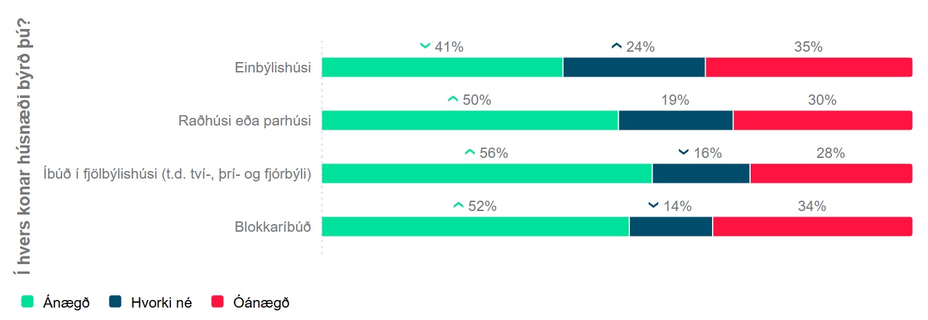 Það sem vekur mesta athygli í könnuninni er að þau sem búa í raðhúsi, parhúsi, íbúð í fjölbýlishúsi eða blokkaríbúð eru marktækt ánægðari með breytinguna en þau sem búa í einbýlishúsi. 35% þeirra sem búa í einbýlishúsi eru óánægðir með breytinguna á lögum um hunda- og kattahald í fjöleignarhúsum, en eins og lagaheitið gefur til kynna þá snertir það ekkert hagsmuni þeirra sem búa í einbýli.