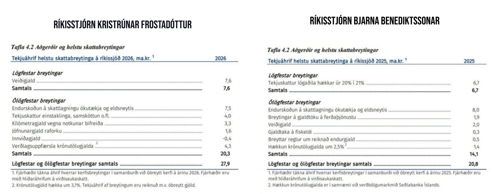Fjárlagafrumvarp núverandi stjórnar leggur til skattabreytingar upp á 27,9 milljarða þar sem kílómetragjald og breyting á vörugjaldi eru fyrirferðamestar. Ef horft er framhjá tekjuaukningu af hækkuðum veiðigjöldum sé núverandi stjórn að leggja til minni breytingar á sköttum og gjöldum en fyrri stjórn.