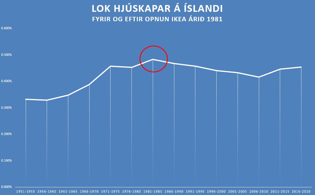 „Rekstur IKEA hófst á Íslandi árið 1981, það er að segja fyrir 44 árum. Áhrif verslunarinnar á hjónabönd hér á landi hafa hins vegar aldrei verið rannsökuð. Er þar vísað bæði til álagsins sem fylgir því að fara í verslunina sjálfa en þó ekki hvað síst þegar kemur að því að setja saman IKEA-húsgögn. Almennt hafa hjónabandsráðgjafar mælt gegn því að hjón setji saman vörur keyptar í versluninni, enda hefur hingað til verið talið að húslestur á IKEA-leiðbeiningum og svo samsetning geti valdið djúpstæðum hjónabandserfiðleikum. Tölur Hagstofunnar sýna þó annað. Lok hjúskapar miðað við fólksfjölda á Íslandi (frá 1951-2020) náðu þannig hámarki í kringum árið 1981, það er að segja þegar IKEA tók til starfa. Frumniðurstöður benda því til þess að hjón fái ákveðna útrás fyrir flókið tilfinningalíf með samlestri IKEA-leiðbeininga og samsetningu gripa. Áður höfðu hjón reynt að lægja tilfinningaöldur með þáttum á borð við rifrildi um uppvaskið en það gafst jafnan illa (auk þess sem innkoma og áhrif uppþvottavélarinnar á hjónabönd hefur enn ekki verið könnuð). Þessi IKEA-áhrif þarf vissulega að rannsaka betur en flest bendir þó til þess að verslunin og samsetningarleiðbeiningar hennar hafi verið hafðar fyrir rangri sök í nærri hálfa öld.“