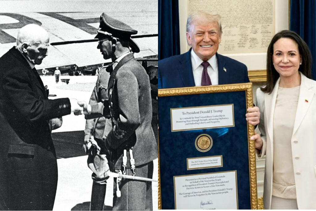 Bent er á að það hafi áður gerst í sögunni að medalíur hafi verið gefnar. Til dæmis hafi norski rithöfundurinn Knut Hamsun gefið Jósef Göbbels, áróðursmálaráðherra Hitlers, nóbelsmedalíuna sína árið 1943, í miðri seinni heimsstyrjöldinni.