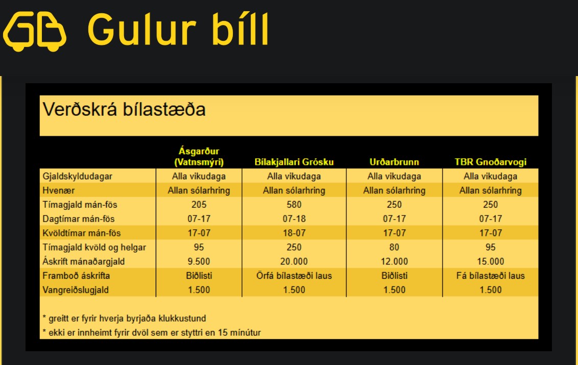 Fyrrum þingkonan lýsir því í athugasemd að vissulega taki fyrirtækið sem rekur bílakjallarann, Gulur bíll, það fram á vefsíðu sinni að rukkað sé fyrir hverja byrjaða klukkustund.