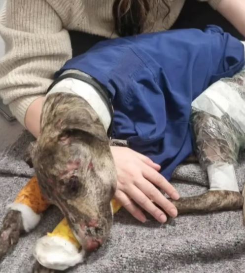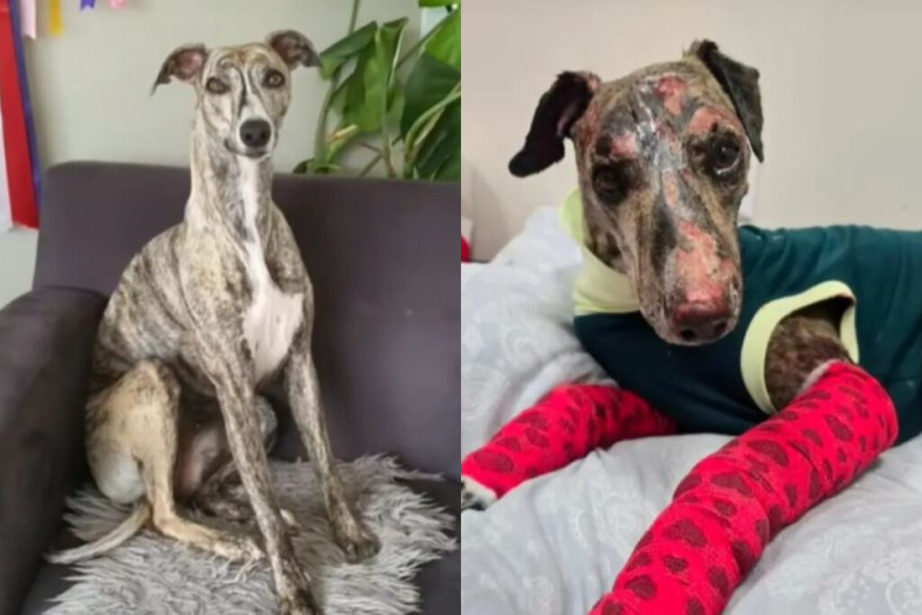 Þó að Whippet hundar séu ekki með mikinn feld þá var Blossom litla logandi þegar hún stökk út um gluggann. Eigendunum var mjög brugðið að sjá þessa sjón. Hún var mjög brennd og slösuð en á lífi.
