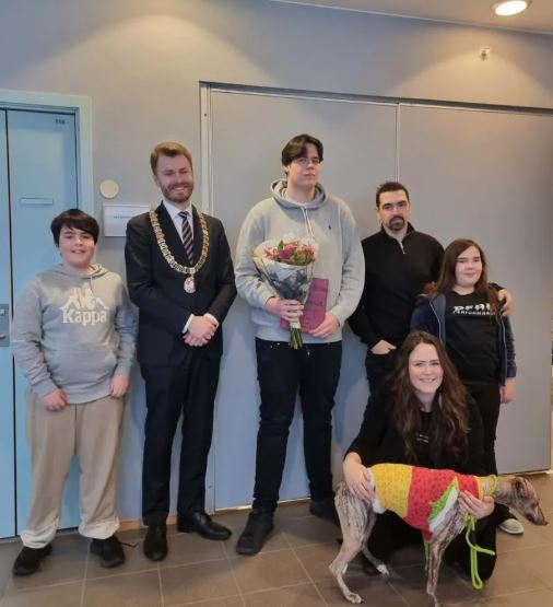 Elsti sonur Anette, var heiðraður af borgarstjóra Ålesund, en hann bjargaði tveimur yngri systkinum sínum út úr brennandi húsinu. Blossom var viðstödd athöfnina.
