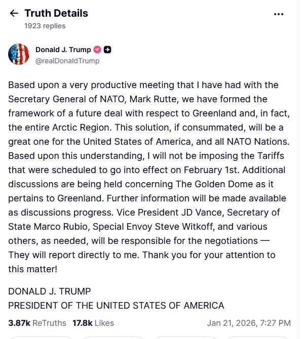 Trump segist hafa átt góðan fund með Mark Rutte framkvæmdastjóra Atlantshafsbandalagsins og þar hafi þeir náð saman um „ramma framtíðarsamkomulags varðandi Grænland og raunar alls heimsskautsins.“ Lausn sem sé frábær fyrir Bandaríkin og öll ríki NATO.