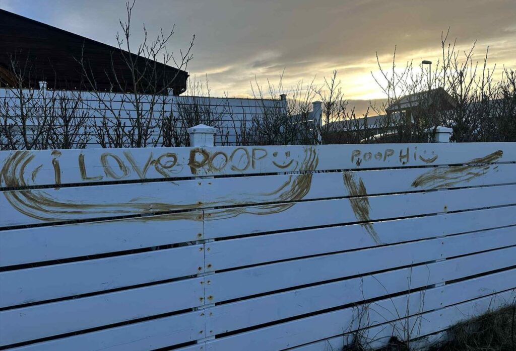Fyrir um viku síðan var mannasaur makað víðsvegar á grindverk í kringum heimili miðaldra hjóna í Garðinum í Suðurnesjabæ. Dóttir konunnar sem býr þar, Shelamarl Diaz, birti myndband af ummerkjunum í íbúahópi á Facebook. Hún skrifar: