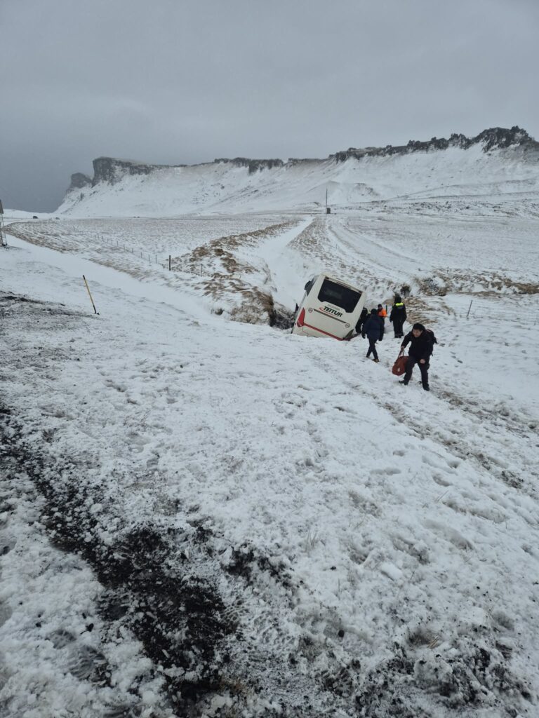 Þær aðgerðir gengu vel og voru allir fluttir í húsnæði Ice Wear í Vík þar sem þau fengu skjól. Rútan var skilin eftir.