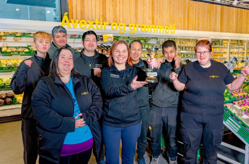Starfsfólk Krónunnar í Borgartúni með verðlaunagripinn. Um er að ræða farandsbikar eftir Stúdíó Fléttu sem er endurnýttur úr eldri verðlaunagripum. Að auki hlýtur starfsfólkið veislu til að fagna árangrinum.