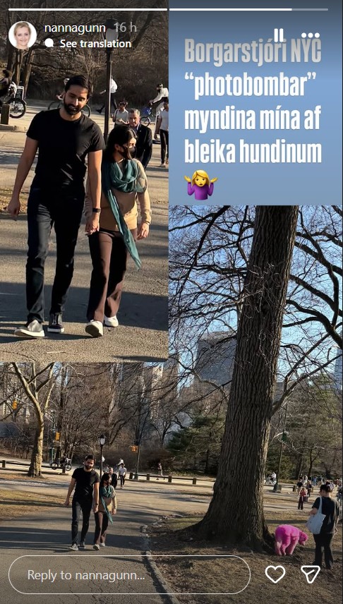 Mannlíf hefur bent á mynd sem Nanna hefur deilt á Instagram úr ferðinni, en svo virðist sem að það hafi vakið athygli þingmannsins að sjá bleikan púðluhund. Ákvað hún að taka mynd af þessum merka hundi en þegar hún skoðaði myndina taldi hún sig í leiðinni hafa fangað sjálfan borgarstjóra New York, Zohran Mamdani, á mynd. Hún birti stækkaða mynd af bakgrunni myndarinnar máli sínu til stuðnings en þar má sjá hávaxinn mann með dökkt hár og skegg. Þessi maður er þó ekki Zohran Mamdani og þar að auki ekkert sérstaklega líkur honum. Auk þess er konan sem maðurinn er að leiða augljóslega ekki eiginkona Mamdani, Rama Duwaji. Ekki er víst hvort þingmaðurinn hafi verið að grínast eða hvort hún hafi í raun og veru farið mannavillt.