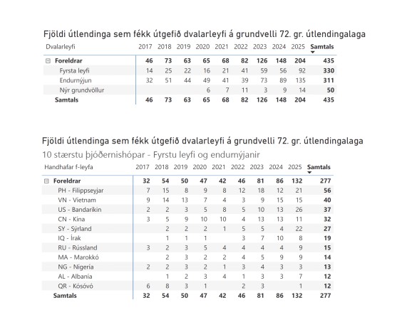 Samkvæmt svari dómsmálaráðherra við fyrirspurn Diljár Mistar Einarsdóttur frá árinu 2024 er ekki algengt að foreldrar fái dvalarleyfi hér á landi á grundvelli fjölskyldusameiningar. Algengast er að slík leyfi séu veitt til maka og barna. Af svari dómsmálaráðherra við fyrirspurn Þórdísar Kolbrúnar Reykfjörð Gylfadóttur sem birtist nú á dögunum má eins sjá að mjög fáir foreldrar frá aðstandendaleyfi á ári hverju. Einkum eru þetta aðilar frá Filippseyjum, Víetnam og Bandaríkjunum.