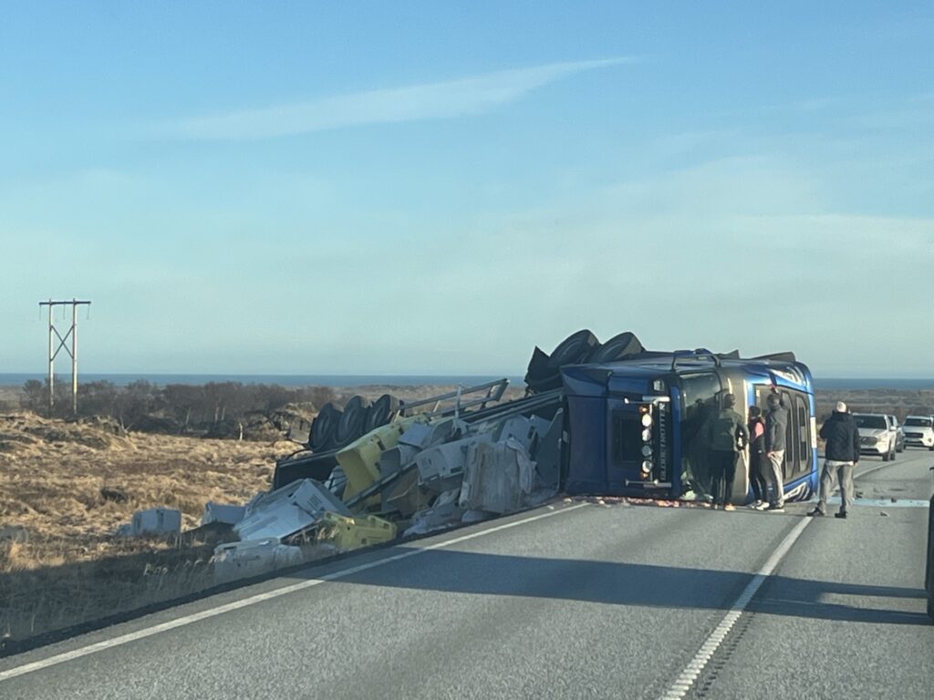 Tildrög slyssins eru ókunn á þessu stigi en miðað við myndir varð töluvert tjón á bifreiðinni og farminum.