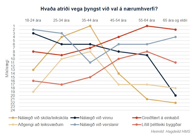 Aðspurð hvaða atriði skipta mestu máli við val á nærumhverfi eru almennt öryggi, gott samfélag og vinaleg samskipti efst á lista. Nálægð við verslanir, náttúru og tengingar við gönguleiðir skipta þátttakendur einnig miklu máli heilt á litið. Bent er á það í mánaðarskýrslu HMS að áherslur taki þó eðlilega breytingum eftir æviskeiðum, líkt og sjá má á myndinni hér að neðan.