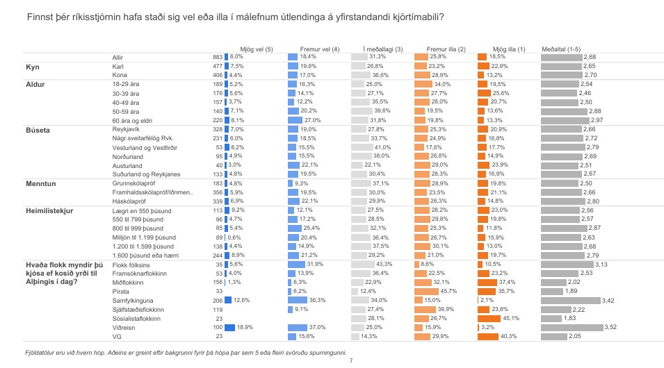 Eins voru svarendur spurðir hvort ríkisstjórnin hefði staðið sig vel eða illa í málefnum útlendinga á yfirstandandi kjörtímabili. Flestir sögðu illa, eða 44 prósent, 24 prósent telja ríkisstjórnina hafa staðið sig vel og 31 prósent segja í meðallagi. Rétt er að taka fram að Maskína kannaði ekki hvort svarendum þætti ríkisstjórnin ekki hafa gert nóg í málefnum útlendinga eða hvort þeim þyki ríkisstjórnin hafa gengið of langt. Af sundurliðun svara má ráða að þeir sem telja ríkisstjórnina hafa staðið sig illa geri það á ólíkum forsendum, en til að mynda er óánægjan meiri meðal stuðningsmanna Pírata heldur en meðal stuðningsmanna Miðflokksins. Sósíalistar eru óánægðastir með frammistöðu ríkisstjórnarinnar í útlendingamálum. Niðurstaðan sýnir því óánægju með aðgerðir ríkisstjórnarinnar en ekki á hverju óánægjan byggir, en ríkisstjórnin hefur bæði verið gagnrýnd fyrir að ganga of skammt sem og of langt.