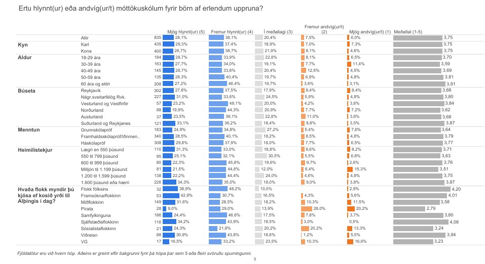 Maskína hefur birt niðurstöður könnunar um málefni útlendinga en þar kemur fram að mikill meirihluti landsmanna (66%) er hlynntur móttökuskólum fyrir börn af erlendum uppruna. Aðeins 14 prósent eru andvígir og 20 prósent í meðallagi hlynntir.