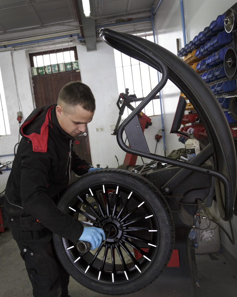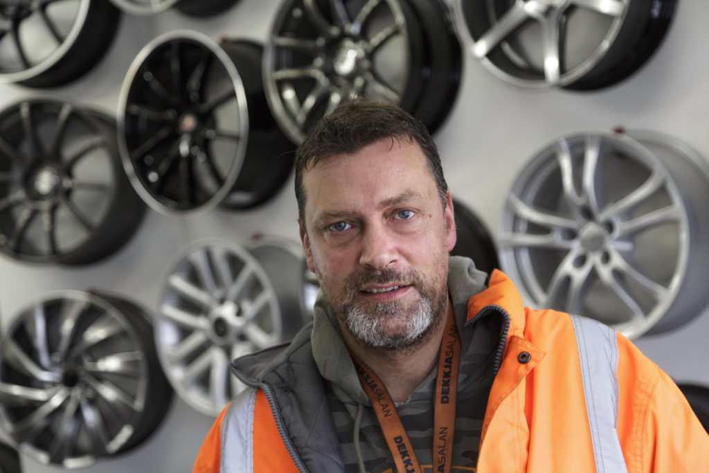 Hann bendir einnig á að Dekkjasalan sé með ýmiss konar þjónustu og aukahluti sem varða felgur. „Við pólýhúðum felgur og lánum dekk og felgur á meðan þannig að bíllinn stoppar ekkert. Hér erum við með felguréttingarbekk og vél til að demantsskera framhliðar á felgum sem hafa skemmst og rispast. Við eigum felgubolta og rær fyrir flestar gerðir bíla, hér eru til miðjuhringir og „spacers“ til að allt passi fyrir hvern bíl. Einnig eigum við loftþrýstiskynjara og getum forritað þá inn í alla bíla.“