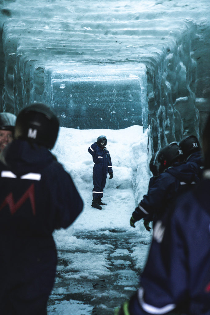 Þaðan er haldið með leiðsögumanni á snjósleðum að íshellinum sem við grófum út í sumar. Hellirinn er staðsettur í yfir þúsund ára gömlu íslagi á jöklinum og er það neðarlega að ísinn er orðinn alveg þéttur og nærri því glær undan þrýstingnum. Þar má meðal annars greina nokkur einkennandi öskulög frá sögufrægum eldgosum sem jöklaleiðsögumaðurinn okkar mun glaður fræða gestina um.“