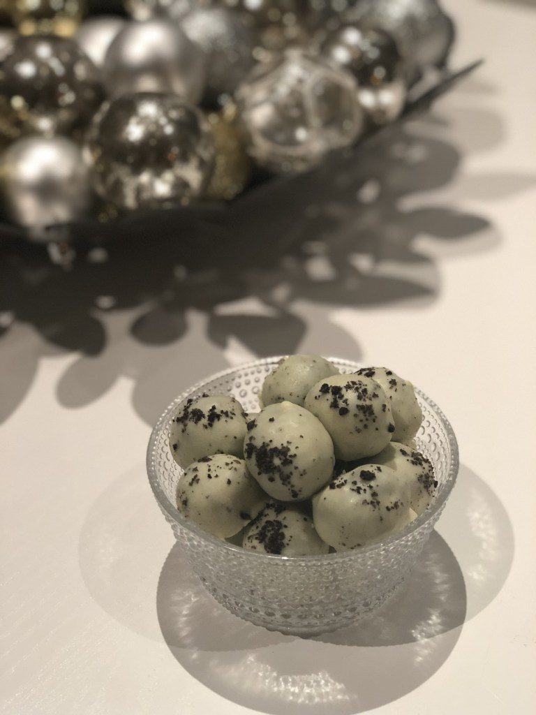 Bræðið hvítt súkkulaði yfir vatnsbaði og hjúpið kúlurnar. Myljið nokkrar oreo kexkökur til viðbótar og stráið smá mulning yfir hverja kúlu þegar búið er að hjúpa hana til skrauts.