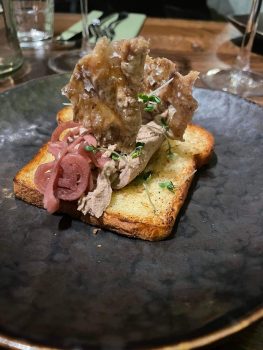 Food & Fun matseðillinn á Duck & Rose er hinn ævintýralegasti fyrir bragðlaukana og með ítölsku ívafi. Fyrst var boðið upp á kjúklinga parfait með stökku kjúklingaskini, sýrðum skalotlauk á brioche brauðið sem bráðnaði í munni. Áferðin og bragðið ljúft undir tönn.
