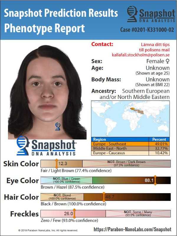 Með nýrri dna-tækni er nú hægt að búa til teikningar af fólki út frá upplýsingum um dna þeirra. Það var nýlega gert í þessu máli. Lögreglan telur að teikningin sýni móður stúlkunnar eða náinn ættingja hennar.