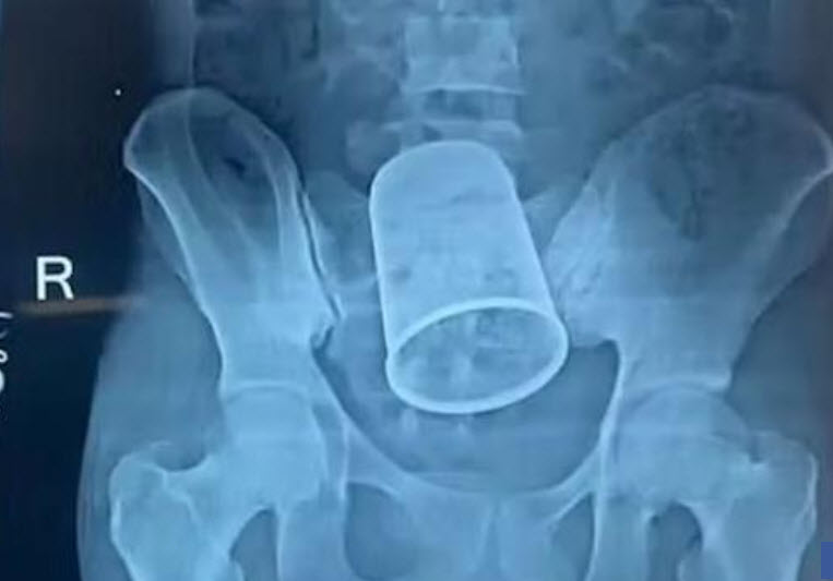 Á röntgenmyndum sást að í endaþarmi hans var 14 cm langur stálbolli fastur. Að vonum kom bollinn í veg fyrir að maðurinn gæti haft hægðir og þar af leiðandi fann hann til mikilla verkja.