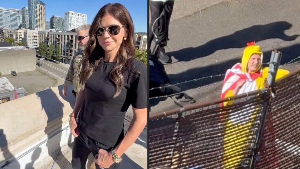 Noem lét mynda sig á þaki húsnæðis útlendingastofnunar í Portland. Með henni í för var íhaldssami áhrifavaldurinn Benny Johnson sem birti mynd af ráðherranum og skrifaði að ráðherrann væri að stara ögrandi á her Antifa, óhrædd. Stuðningsmenn ríkisstjórnarinnar hrósuðu ráðherranum fyrir hugrekkið, að standa þarna undir berum himni óhrædd andspænis óvininum – Antifa.