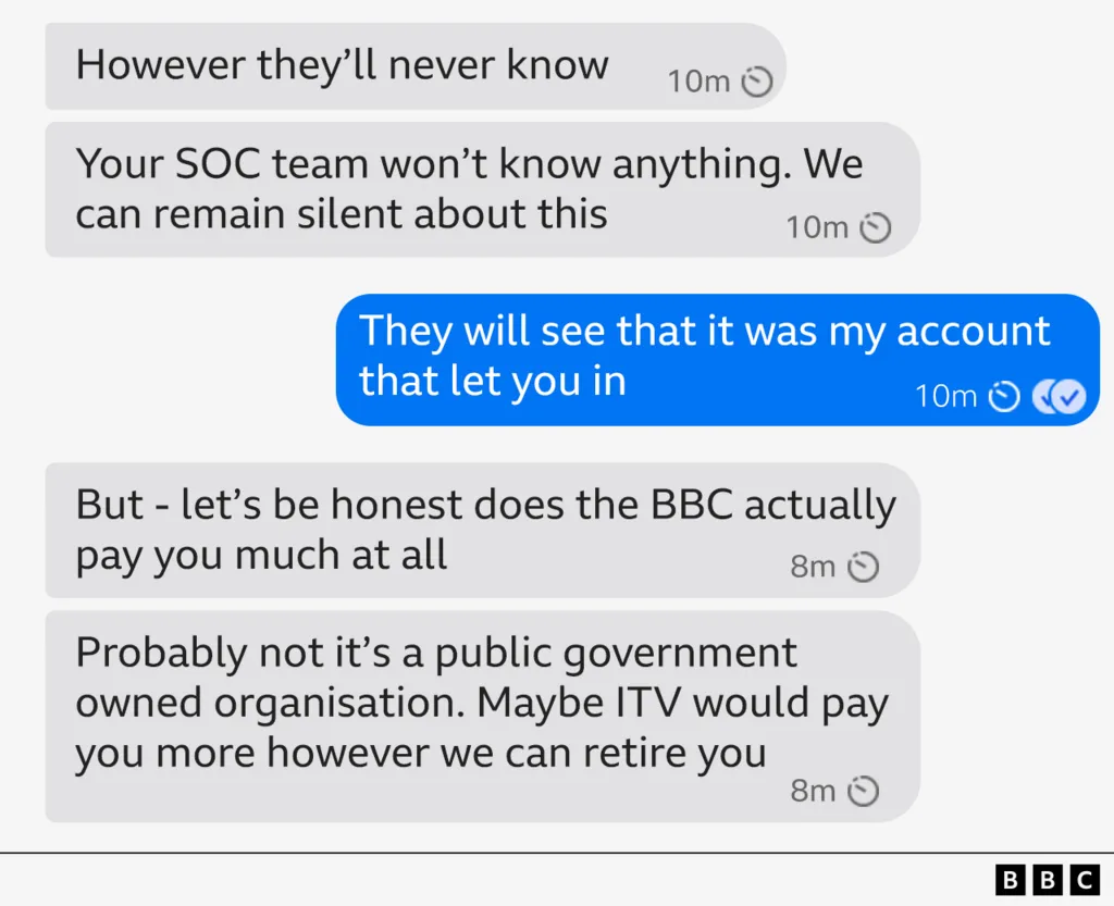 „Við vitum ekki hvað BBC borgar þér í laun en segjum sem svo að þú fengir 25% hlut af því sem BBC myndi borga okkur. Og við myndum krefjast 1% af heildarársveltu BBC. Þú þyrftir aldrei að vinna aftur,“ sagði Syndicate í skilaboðunum.