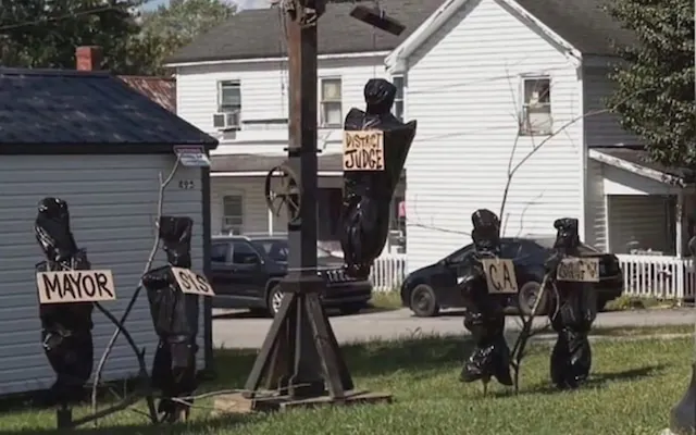 Maðurinn, Stephan Marcum, er 58 ára en í hrekkjavökuskreytingunum mátti meðal annars finna líkbrúður sem áttu að tákna ýmsa embættismenn í bænum Stanton þar sem hann er búsettur.