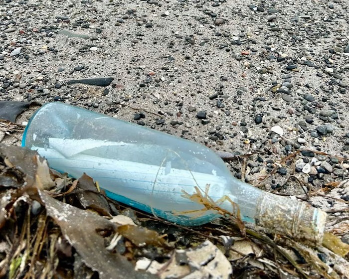 Þetta var glerflaska, veðruð af tíma og sjó, en samt heil. Inni í henni? Gulnaður pappírsmiði.