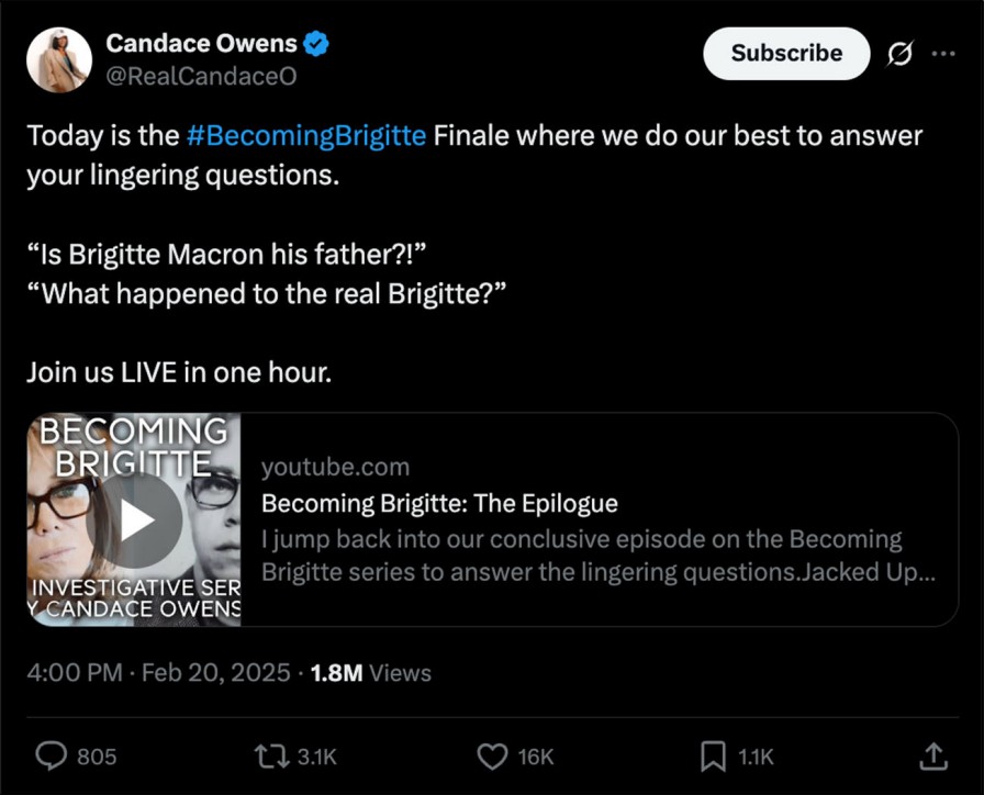 Candace Owens hefur lengi haldið því fram að Brigitte Macron sé trans kona. Hún hafi fæðst karlkyns en sé að villa á sér heimildir. Nafninu Brigitte sé stolið en við fæðingu hafi forsetafrúin fengið nafnið Jean-Michel Trogneux. Þessu til stuðnings hefur Owens rakið að fáar myndir séu til úr æsku Brigitte eða frá þeim tíma sem hún á að hafa gengið með börn sín þrjú. Forsetahjónin rekja í stefnunni að Jean-Michel sé vissulega til. Hann er eldri bróðir Brigitte. Eins séu vissulega til myndir úr æsku hennar, hún á fjölda systkina og þrjú börn.
