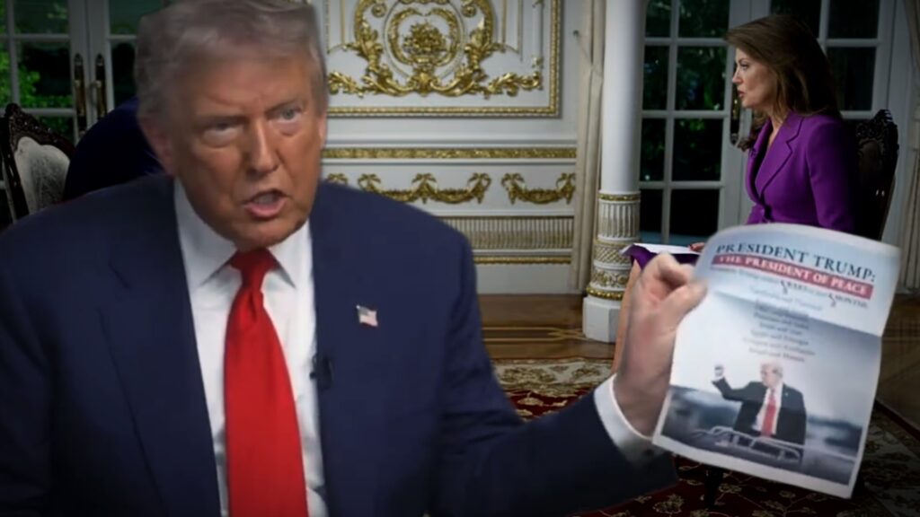 Trump fullyrti í viðtalinu að honum hafi tekist að binda endi á átta stríð. Máli sínu til stuðnings tók hann fram útprent af færslu frá einu ráðuneyti hans á samfélagsmiðlum þar sem er fullyrt að hann hafi bundið endi á átta stríð.