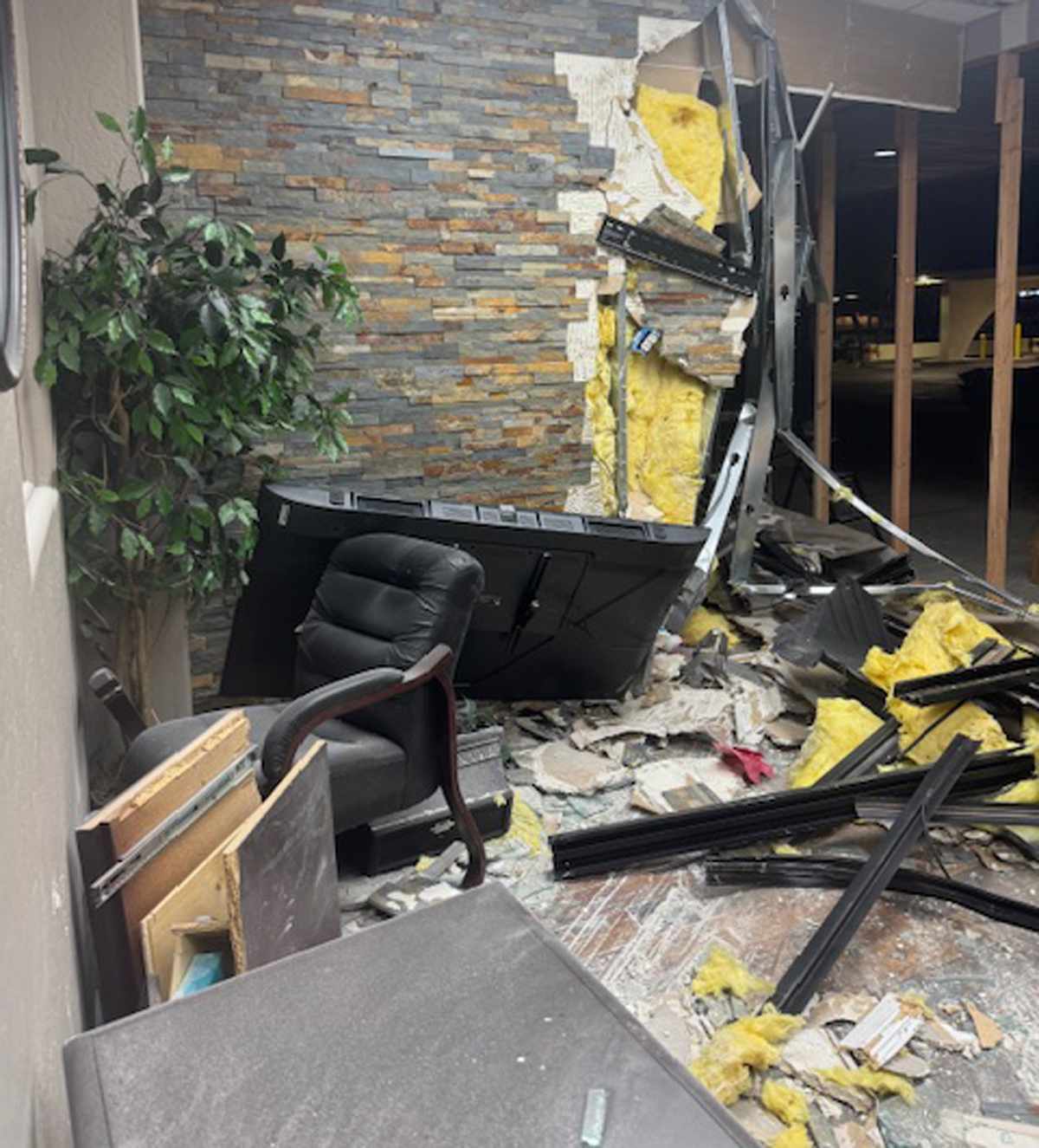 „Þetta leit út eins og sprenging. Bíllinn, það var fólksbíll,  keyrði bara beint í gegn og klessti á,“ sagði Alison Briggs, meðeigandi í My Arizona Lawyers, fyrirtækinu sem varð fyrir árekstrinum. „Þið getið séð dekkjaförin hérna. Bíllinn keyrði hér í gegn og svo beint í gegnum þessi spjöld, sem er hluti af anddyri okkar og síðan aðalfundarsalinn okkar.“