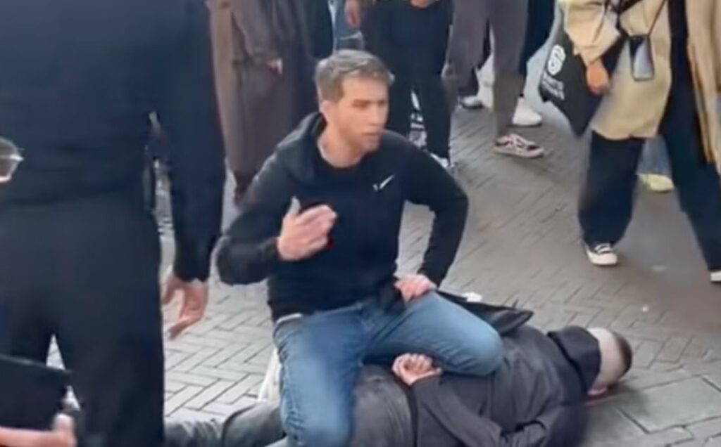 Á upptökum sést maðurinn krjúpa ofan á hnífamanninum og hóta að kýla hann á meðan hann bíður eftir að lögreglan komi á vettvang. Þetta gerðist nærri Dam‘s Square á fimmtudaginn.