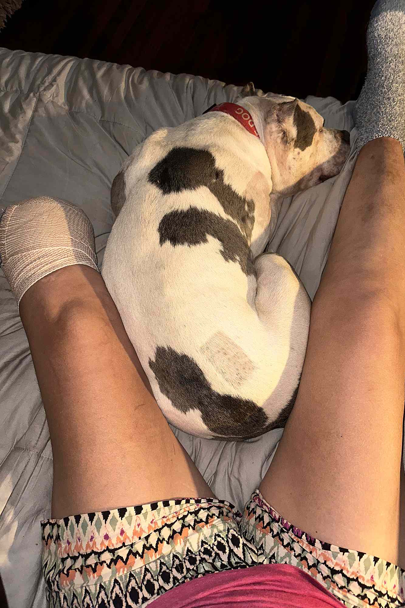 „Þegar hann réðst á hinn hundinn minn, Ralphie, komst ég á milli þeirra og þá greip Dennis um fótinn á mér og sleppti ekki,“ sagði hún við The Mirror. „Ég var svolítið hrædd, en ég hef áður leyst upp hundaslagsmál og fann engan sársauka vegna adrenalínsins.“