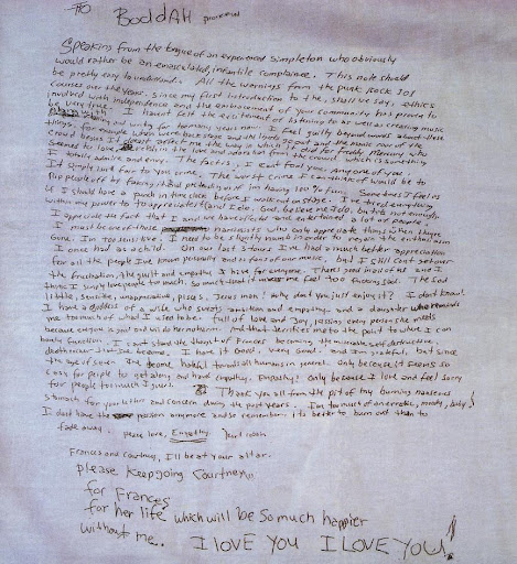 Á vettvangi fannst kveðjubréf en teymið telur að það sé falsað. Meirihlutinn sé vissulega ritaður af Cobain en líklega hafi hann þar bara verið að skrá niður hugsanir sínar og það að hann vildi hætta í Nirvana. Síðustu línurnar skeri sig úr. Þær eru ritaðar með öðrum hætti.