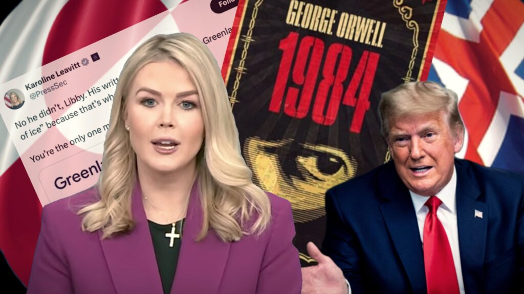 Blaðamaðurinn spilar svo upptöku úr ræðu Trumps og rifjar upp tilvitnun úr vísindaskáldsögunni frægu, 1984, eftir George Orwell.