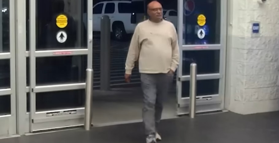 Skjáskot af upptöku úr öryggismyndavél þar sem sjá má Mahendra Patel ganga inn í verslunina daginn örlagaríka. Mynd: Skjáskot/Youtube.