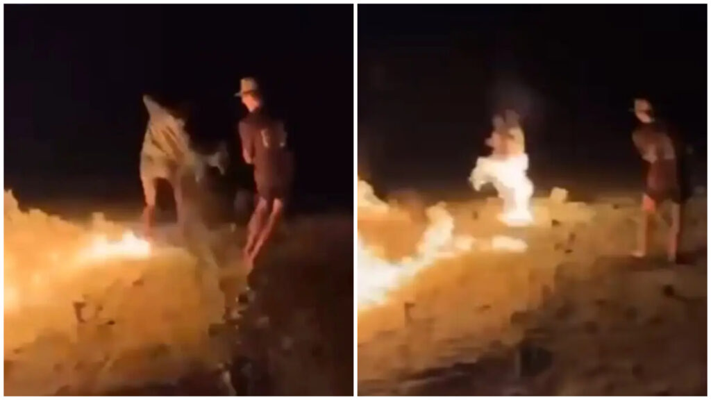 Myndefni úr farsíma sýnir hann hella bensíni á eldinn með þeim afleiðingum að mikill eldur blossaði upp. Í kjölfarið hljóp hann að vini sínum, sem sat nálægt eldinum, og hellti eldfimum vökva við fætur hans og á fótleggi hans með þeim afleiðingum að hann varð alelda á svipstundu.
