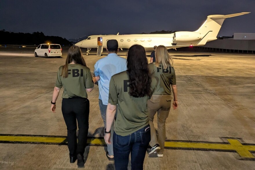 Fulltrúar FBI fylgja Amin um borð í flugvél til Alaska. Mynd/FBI