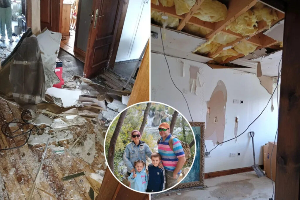 Þegar fjölskyldan kom aftur heim í fimm herbergja íbúð sína í Vestur-Lothian í Skotlandi komu þau að heimilinu gjörsamlega í rúst eftir að frosin pípa á háaloftinu sprakk. Tjónið er rúmlega 26 milljónir króna.
